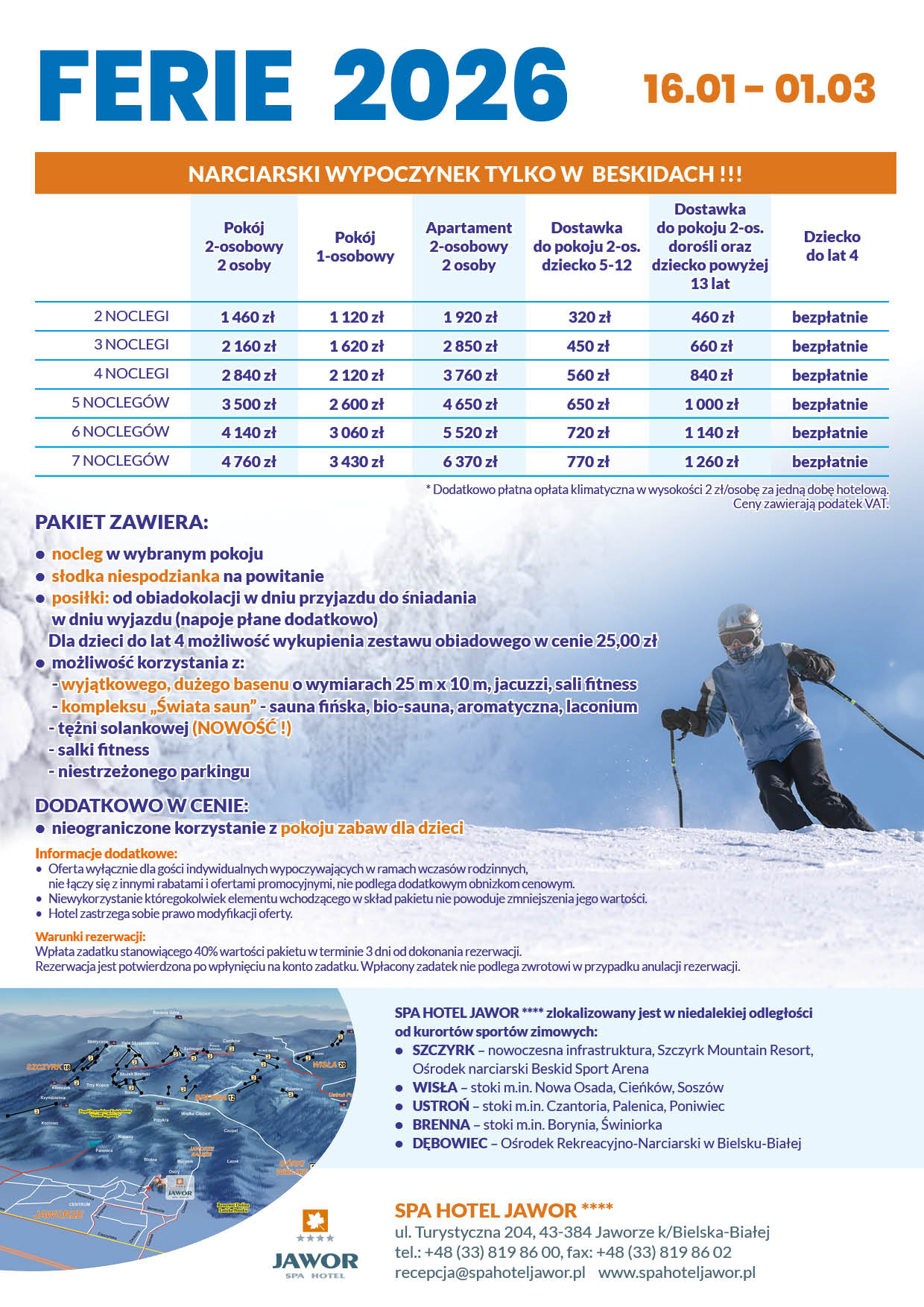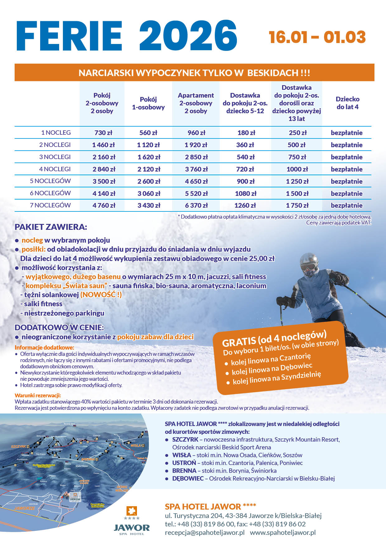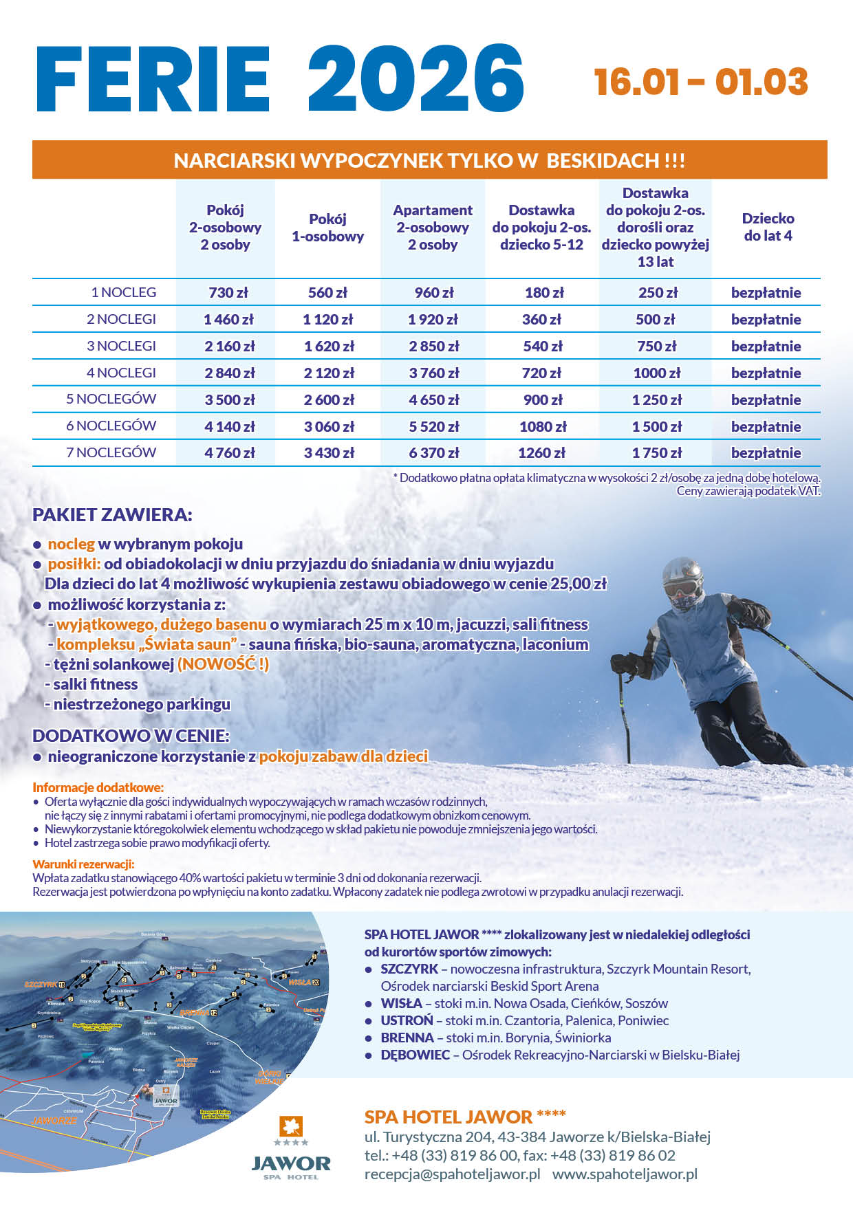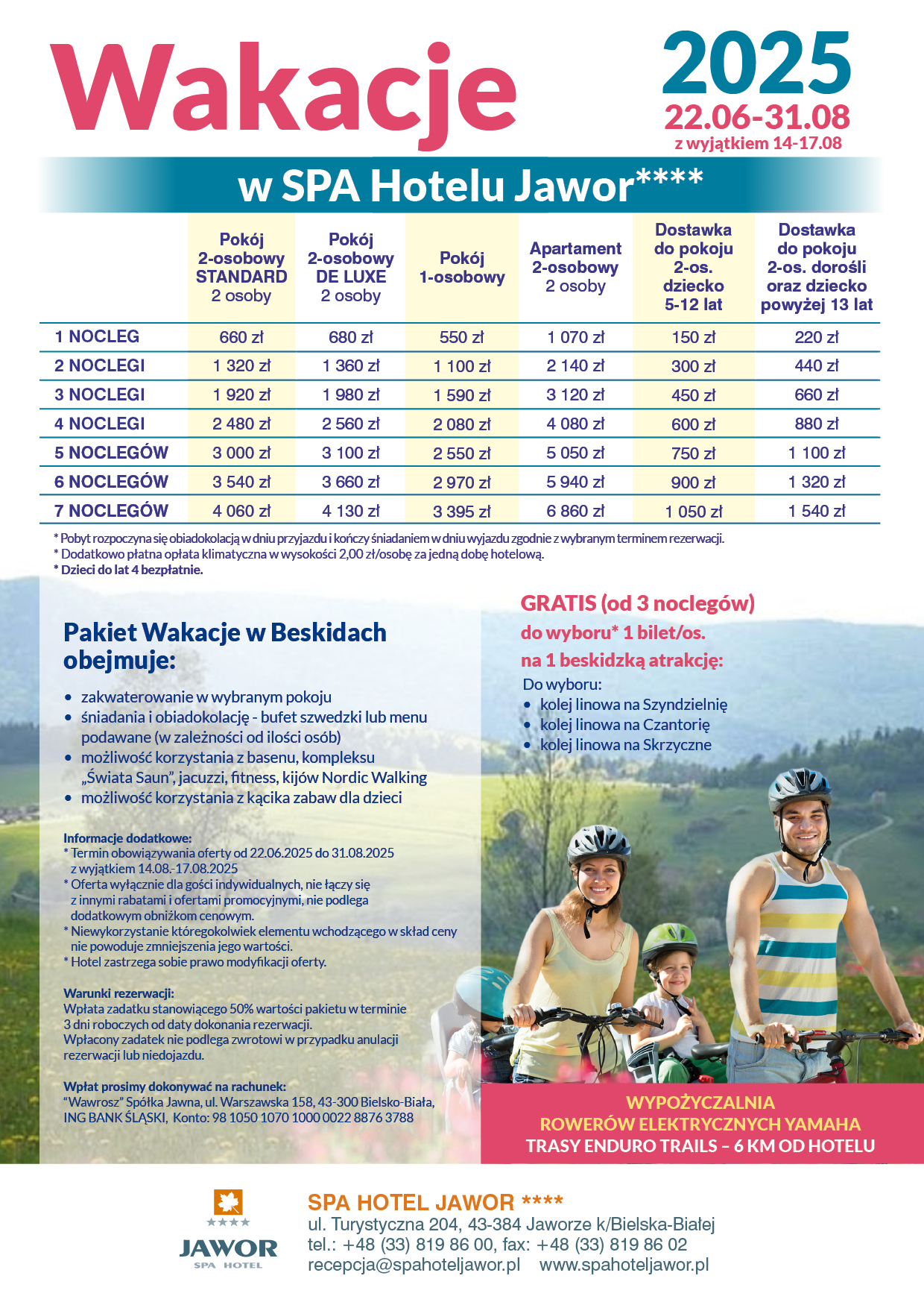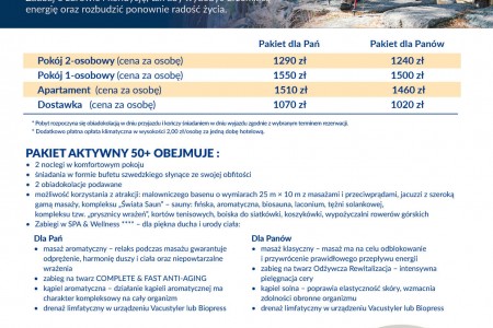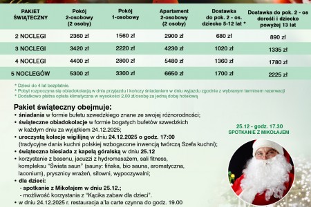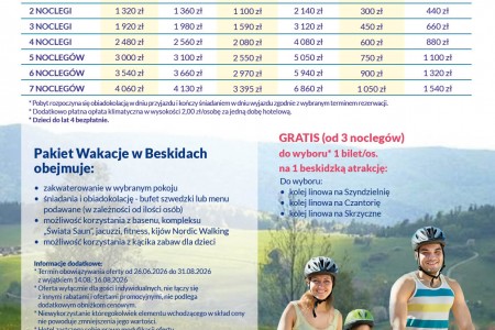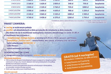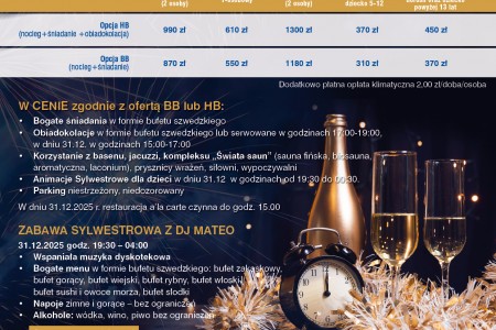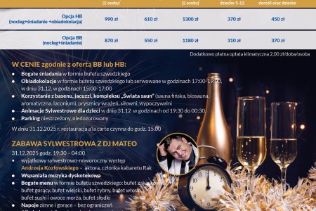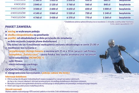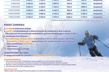 * Dodatkowo płatna opłata klimatyczna w wysokości 2,00 zł/osobę za jedną dobę hotelową.